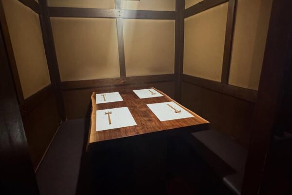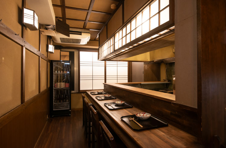 店内は落ち着いた雰囲気で、静かな時間を大切にした懐かしい空間です。料理人の技を間近でご覧いただけるカウンター席と、接待や大切な会食に最適な半個室をご用意。完全予約制だからこそ、周囲を気にせずゆっくりとお食事をお楽しみいただけます。