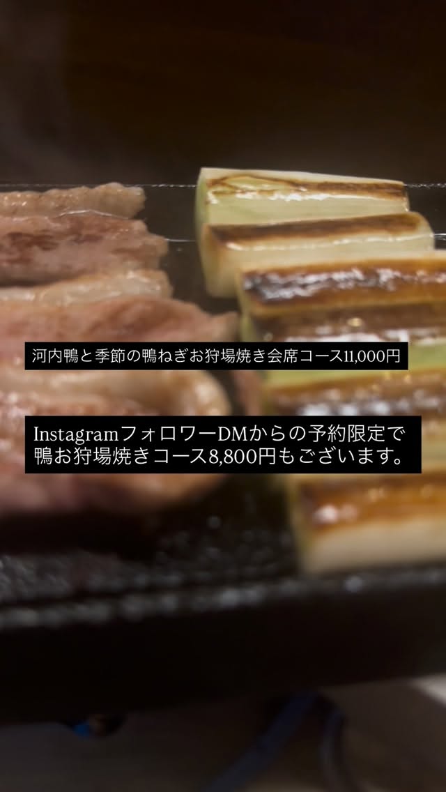 ・河内鴨と季節の鴨ねぎお狩場焼き会席コース11,000円 Instagramフォロワー限定で鴨お狩場焼きを堪能いただける ・河内鴨お狩場焼きコース8,800円