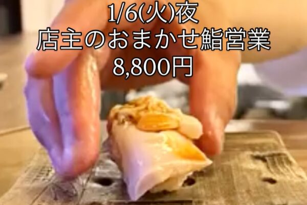 1/6(火)夜18:00-19:30最終入店。 店主のおまかせ鮨営業をさせていただきます。 いつもは月一土日昼のおまかせ鮨営業ですが週末は通常営業で忙しい為、今月のおまかせ鮨営業はこの回のみとなります…